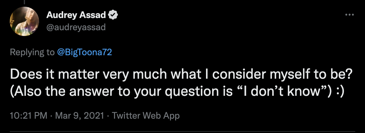 My ethos lies solely in the fact that my whole life has been a nonlinear pattern of deconstruction and people have loved me at all points of my “journey.” I went from traditional Assemblies of God roots to nondenominational, then to universalist, Reformed Baptist, and now somewhere more progressive than ever before. On that-- I don’t know how to define where I’m at right now, other than that I have a lot of questions and am open to a lot of answers. Audrey Assad, a singer/songwriter who I respect, Tweeted this in response to a doctrinal question: